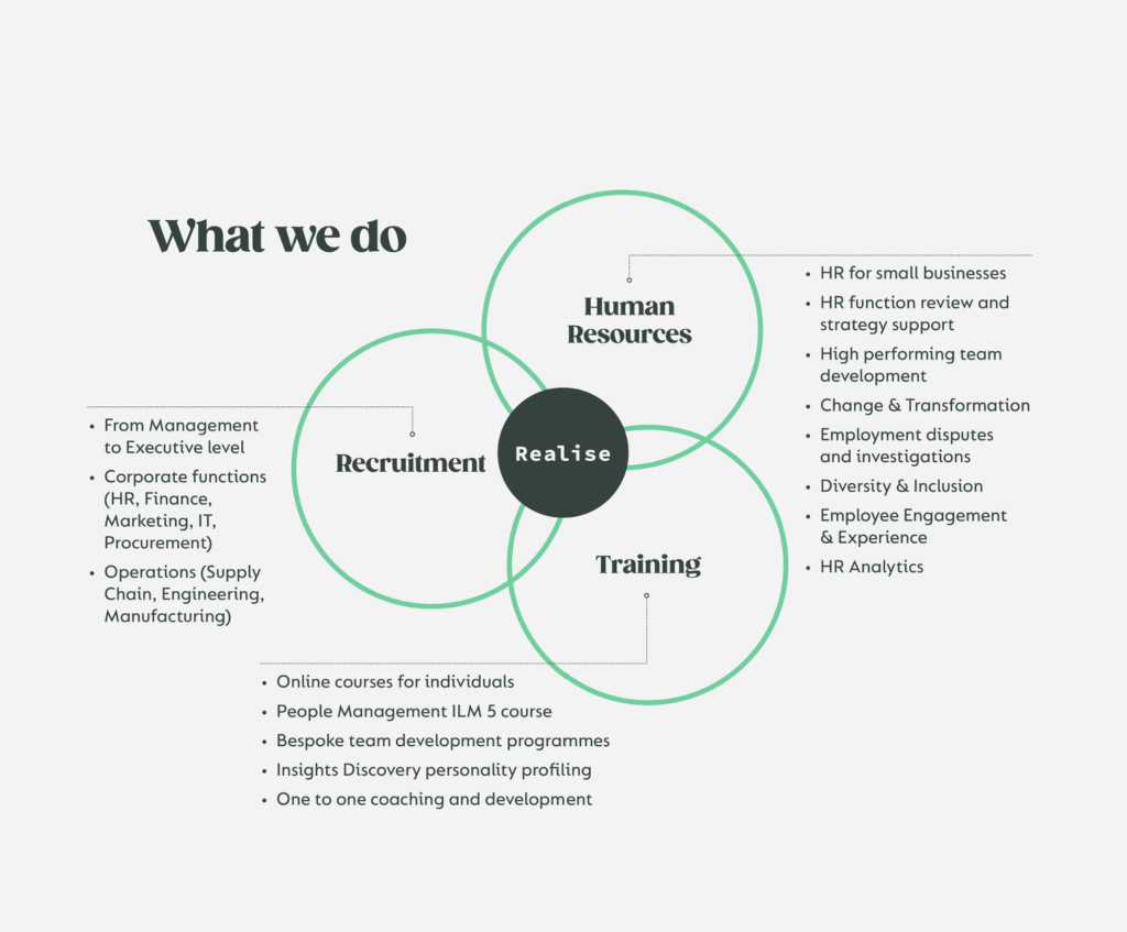 Realise offers small business support for businesses requiring outsourced HR managed services, HR Consultancy supporting large organisations with people and culture related projects, and our Recruitment division, matching management to executive talent to great businesses within Corporate Functions and Operations. We are passionate about investing in employees to drive performance. We design and deliver bespoke learning and development programmes for managers, leaders and teams.